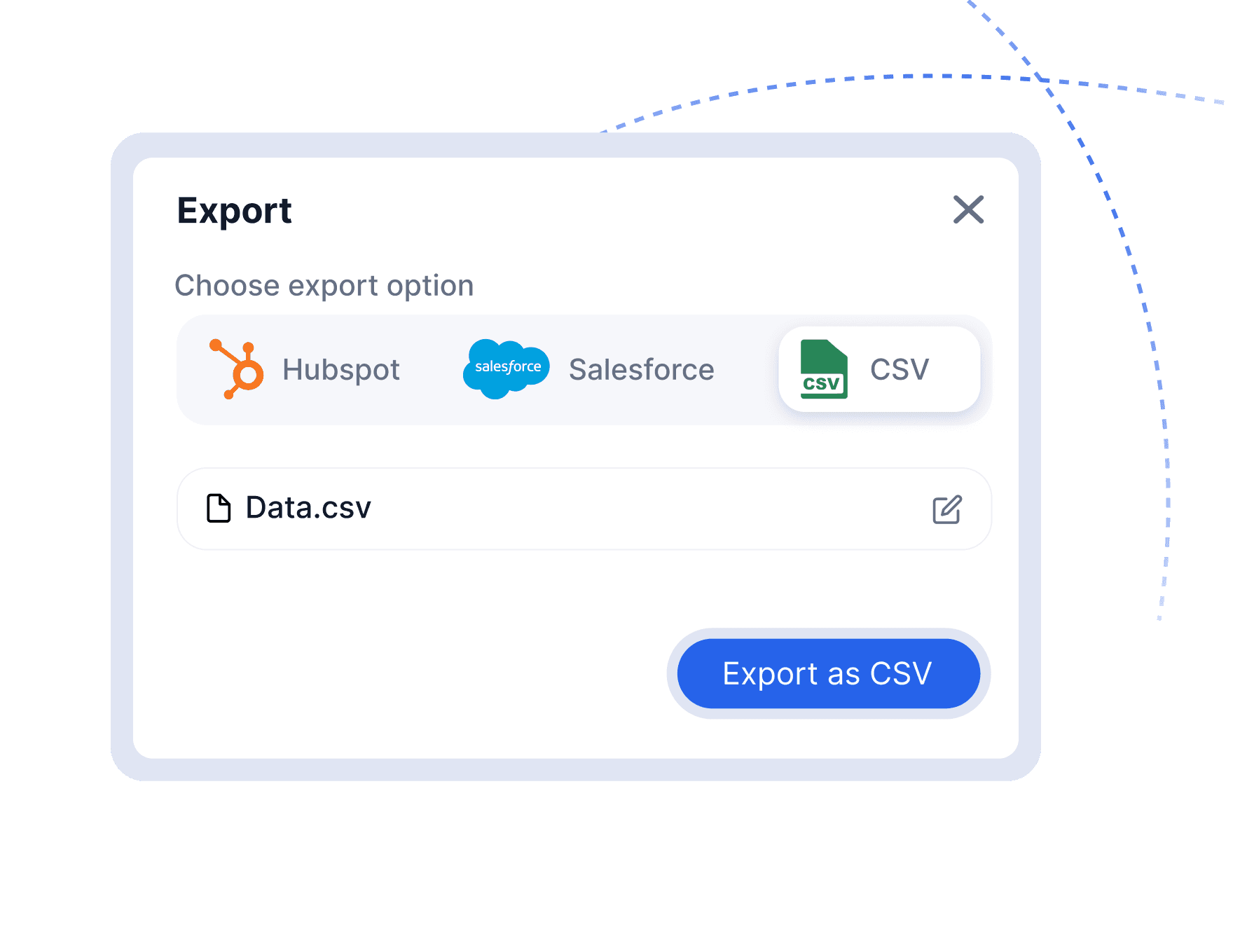Save leads into curated lists, organize columns, and export to CSV or push to your CRM.