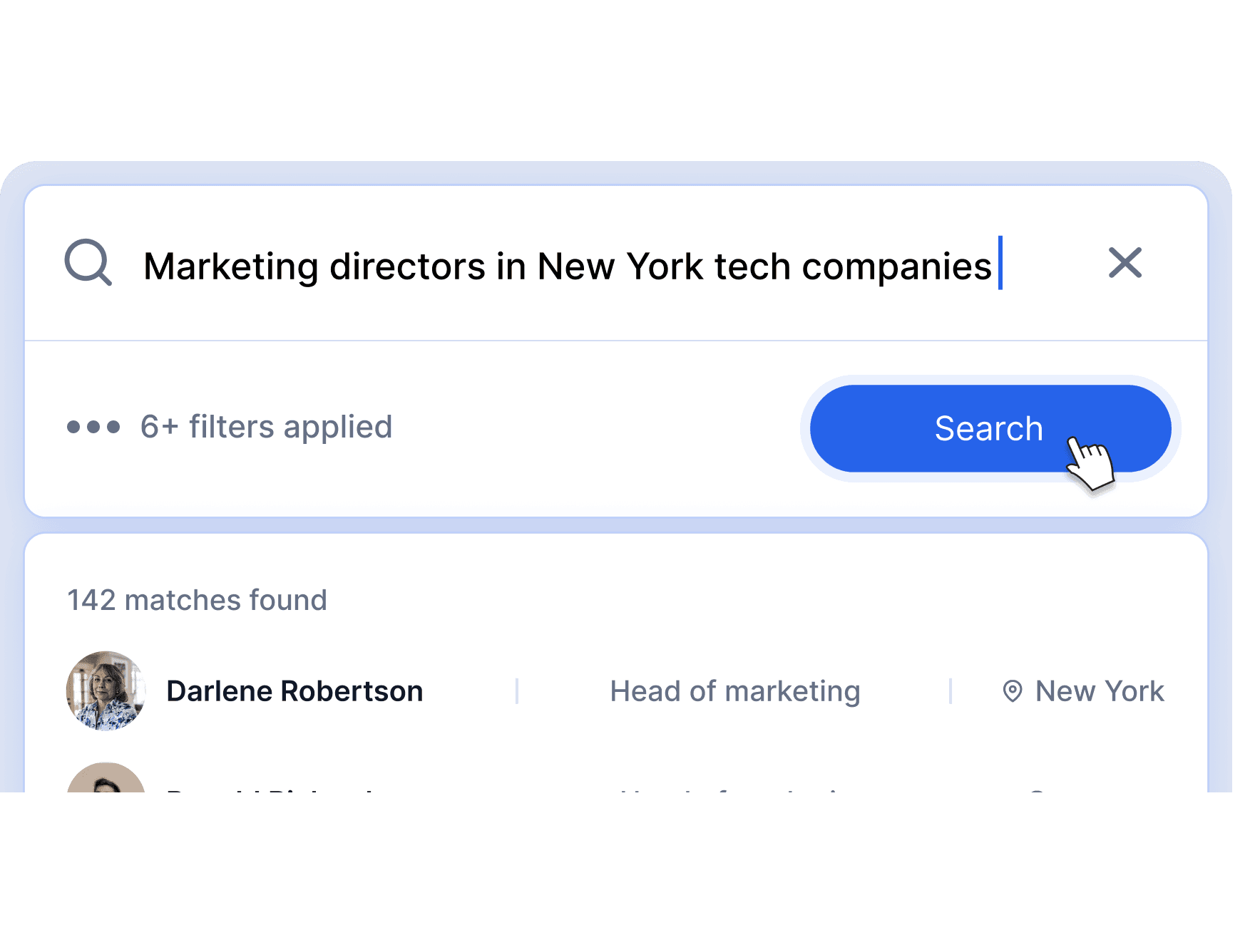 Type exactly what you want — “Marketing directors in Berlin fintech startups” — and get structured results instantly.